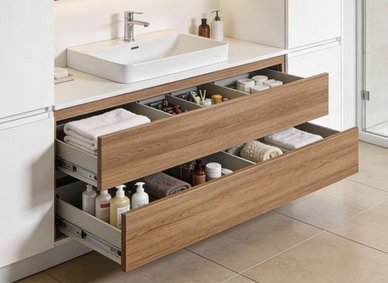 Schlanke Waschtische: Schmale, tiefenreduzierte Waschtische oder Ecklösungen sorgen dafür, dass Bewegungsflächen erhalten bleiben. Kombiniert mit einem passenden Unterschrank schaffen sie Stauraum, ohne den Raum zu überladen.